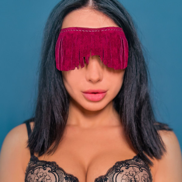 Маска выпол­нена из натуральной кожи, бахрома сверху из замши в винном цвете