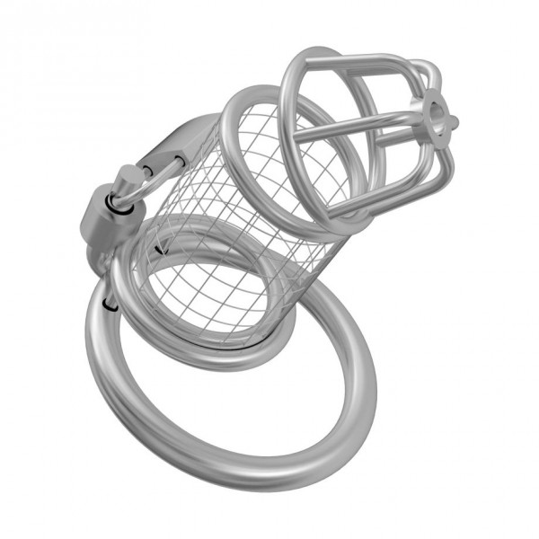 Выпол­нен пояс вер­но­сти из хирургической стали - абсо­лютно гипо­ал­лерген­ного мате­ри­ала. Ствол закрыт металлической сеткой, на головке решетка, кото­рая создает вен­ти­ляцию и создана для комфорт­ного моче­испус­ка­ния. Эрекци­он­ное метал­ли­че­ское кольцо с надеж­ным зам­ком удержи­вает кон­струкцию на теле мужчины!