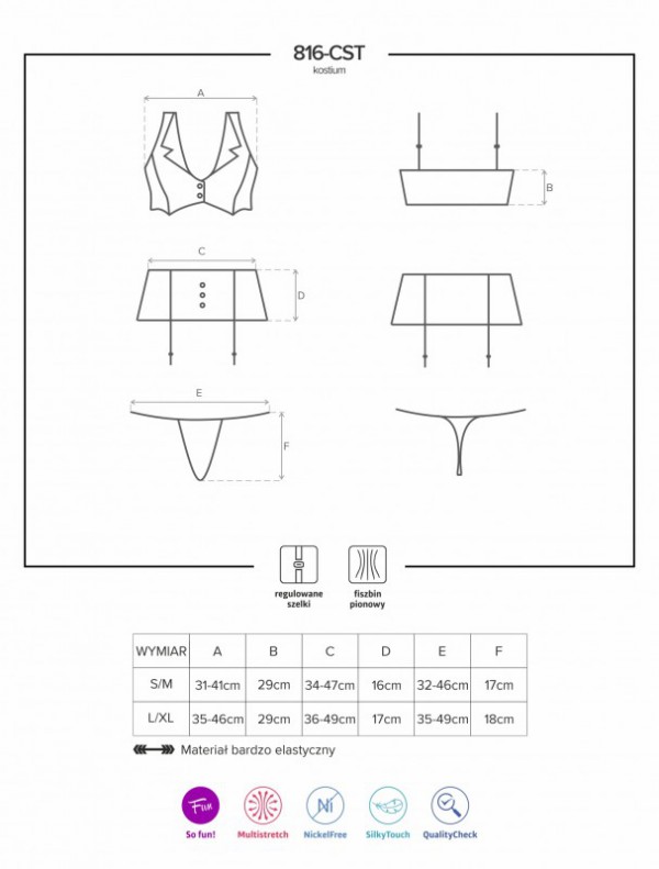 - Мини-юбочки, выполненной в одном стиле с топом, декорированной тремя пуговицами и прозрачными вставками по бокам. Регулируемые пажи для чулок позволяют подогнать изделие для любого роста. Пажи не съемные